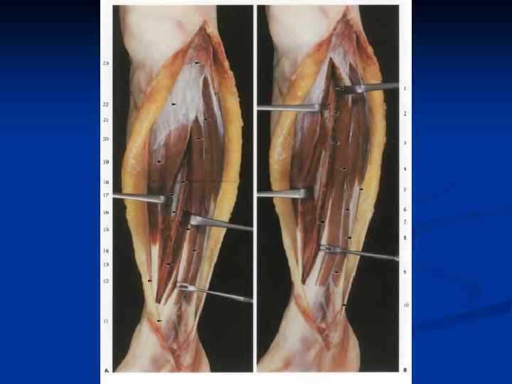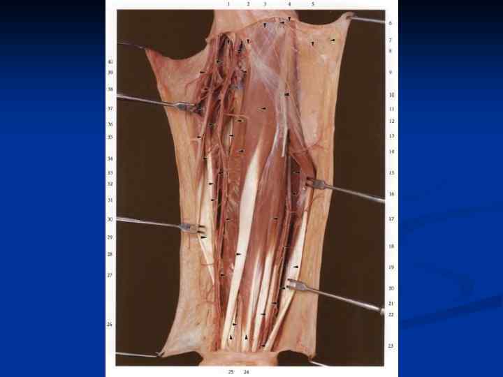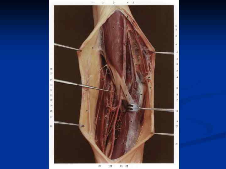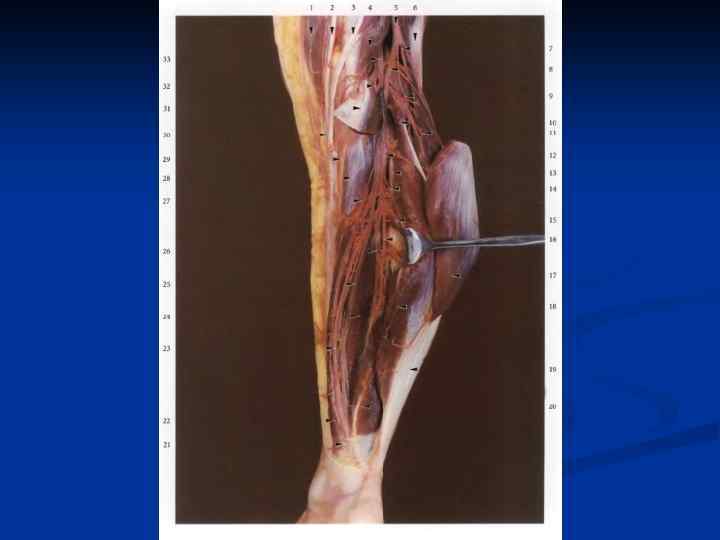 Обнажение лучевой артерии. 1 – проекция лучевой артерии 2 – разрез кожи в Н/3 предплечья 3 – плечелучевая мышца 4 – лучевая артерия 5 – фасция предплечья 6 – лучевой сгибатель кисти