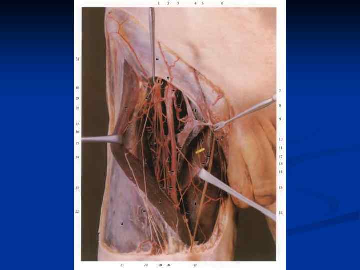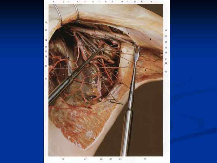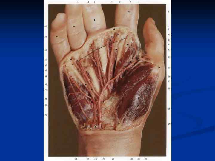 Области коллатерального кровообращения. На верхней конечности: 1. Анастомозы подмышечной артерии с ветвями 2. Анастомозы глубокой артерии плеча с ветвями 3. Артериальная сеть локтевого сустава 4. Анастомозы кисти подключичной плечевой возвратной луч. межкостной коллатеральные (локт. и луч. ) возвратные (локт. и луч. ) поверхностная глубокая артериальные дуги