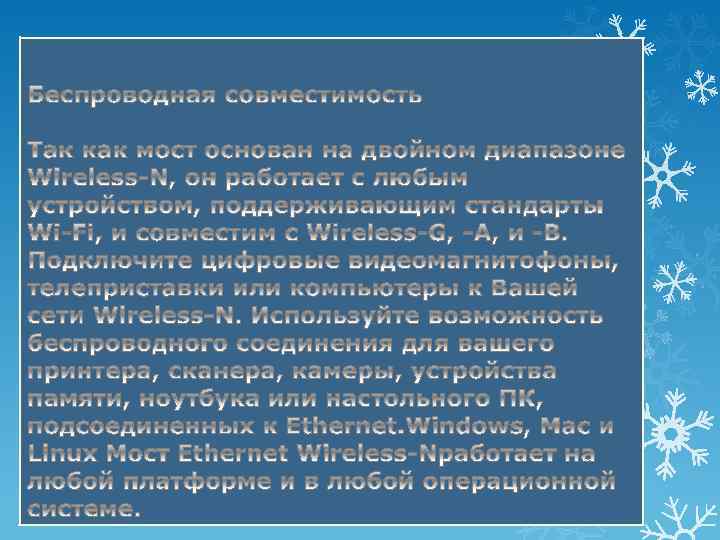 Универсальный беспроводной мост Wireless-NEthernet Bridge с двойным диапазоном может сделать любое проводное устройство, подключенное к локальной сети Ethernet, частью вашей беспроводной сети. Он оптимизирован для потокового видео, чтобы практически устранять пропадание кадров. Он также идеален для совместного использования музыки, фотографий, кинофильмов и других файлов посредством беспроводной связи во всем доме.