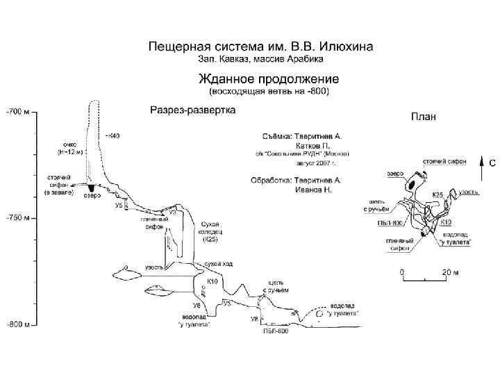 Каждая карта должна иметь условные обозначения и содержать наименование объектов. Легенда – отвечает на вопросы: Кто и когда делал топосьемку (полевые работы); Кто и когда чертил эту карту (камеральные работы); Условные обозначения: сталактиты, сталагмиты, сталагнаты; сифоны; натеки и т. д. и т. п. Наименования объектов: большой колодец; тупик; сифон № 1; У 3 (уступ 3 метра); К 150 (колодец глубиной 150 метров). Масштаб – отношение длины на местности к единице длины на карте В спелеологии чаще всего используется 2 стандартных масштаба: 1: 200 – для полостей протяженностью меньше 50 м 1: 500 – наиболее часто используемый