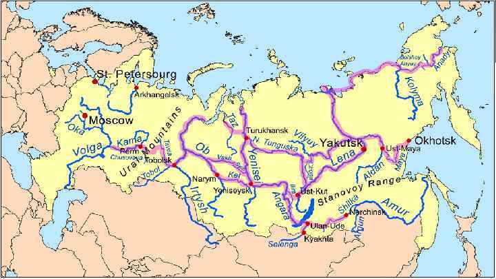 Водные пути ● ● ● В Сибири для судоходства использовалось не менее 24 рек. Из них лишь по восьми движение осуществлялось вверх и вниз по течению, на остальных шестнадцати велся лишь сплав товаров и леса по течению. Речное судоходство ограничивалось природными условиями: лед на реках дер жался от 5 до 8 месяцев. Три «великие сибирские реки» — Обь, Енисей и Лена — все впадают в Северный Ледовитый Океан, то основной проблемой было найти части или ветви этих рек, которые текут примерно с востока на запад и найти короткие промежутки между ними, которые можно преодолеть Волоком Обь Енисей Лена