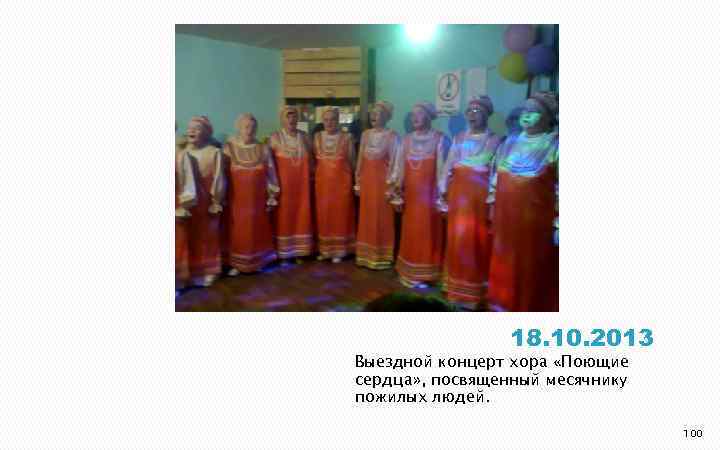 18. 10. 2013 Выездной концерт хора «Поющие сердца» , посвященный месячнику пожилых людей. 100