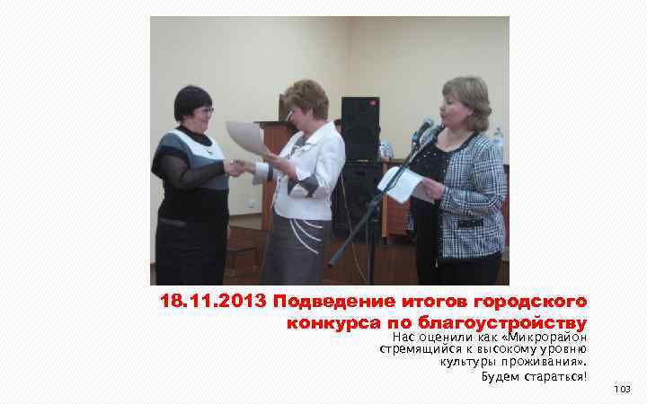18. 11. 2013 Подведение итогов городского конкурса по благоустройству Нас оценили как «Микрорайон стремящийся к высокому уровню культуры проживания» . Будем стараться! 103