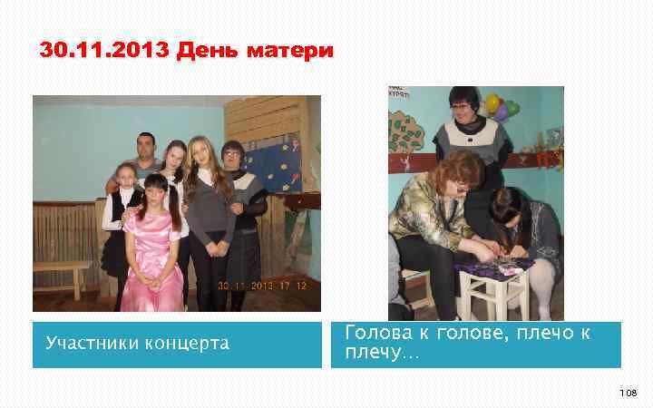 30. 11. 2013 День матери Участники концерта Голова к голове, плечо к плечу… 108