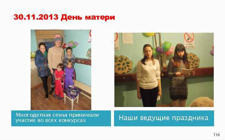 30. 11. 2013 День матери Многодетная семья принимали участие во всех конкурсах Наши ведущие праздника 110