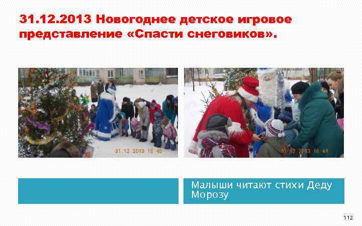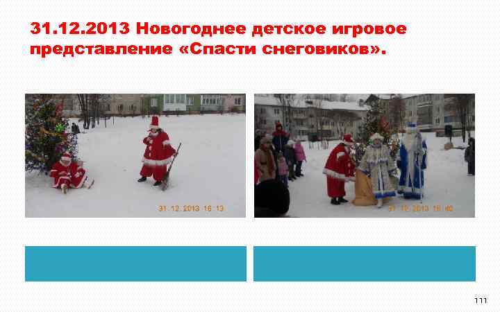 31. 12. 2013 Новогоднее детское игровое представление «Спасти снеговиков» . 111