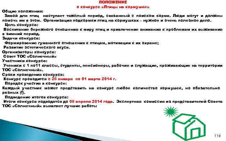 ПОЛОЖЕНИЕ о конкурсе «Птицы на кормушке» Общие положения: Зимой для птиц наступает тяжёлый период, связанный с поиском корма. Люди могут и должны помочь им в этом. Организация подкормки птиц на кормушках – нужное и очень полезное дело. Цель конкурса: Воспитание бережного отношения к миру птиц и привлечение внимания к проблемам их выживания в зимний период. Задачи конкурса: Формирование гуманного отношения к птицам, мотивации к их охране; Развитие эстетического вкуса. Организаторы конкурса: Совет ТОС «Солнечный» Участники конкурса: Ученики с 1 по 11 классы, студенты, пенсионеры, рабочие и служащие, проживающие на территории ТОС «Солнечный» . Сроки проведения конкурса: Конкурс проводится с 26 января по 01 марта 2014 г. Порядок участия в конкурсе: Каждый участник может представить на конкурс любое количество кормушек, но обязательно разных (!). Подведение итогов конкурса: Итоги конкурса подводятся до 08 апреля 2014 года. Экспертная комиссия из представителей Совета ТОС «Солнечный» выявляет лучшие работы 119