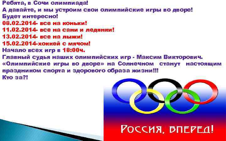 Ребята, в Сочи олимпиада! А давайте, и мы устроим свои олимпийские игры во дворе! Будет интересно! 08. 02. 2014 - все на коньки! 11. 02. 2014 - все на сани и ледянки! 13. 02. 2014 - все на лыжи! 15. 02. 2014 -хоккей с мячом! Начало всех игр в 18: 00 ч. Главный судья наших олимпийских игр - Максим Викторович. «Олимпийские игры во дворе» на Солнечном станут настоящим праздником спорта и здорового образа жизни!!! Кто за? ! 121