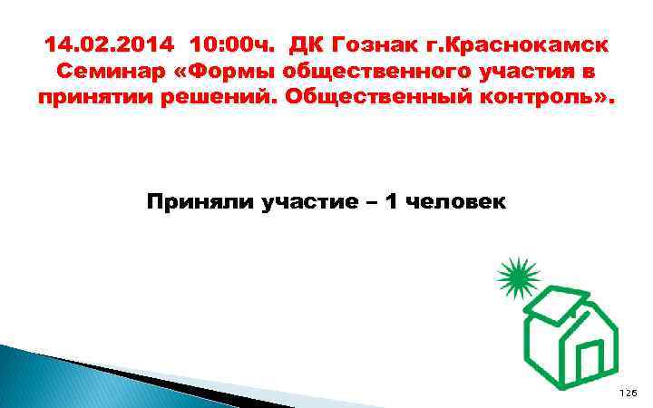 14. 02. 2014 10: 00 ч. ДК Гознак г. Краснокамск Семинар «Формы общественного участия в принятии решений. Общественный контроль» . Приняли участие – 1 человек 126
