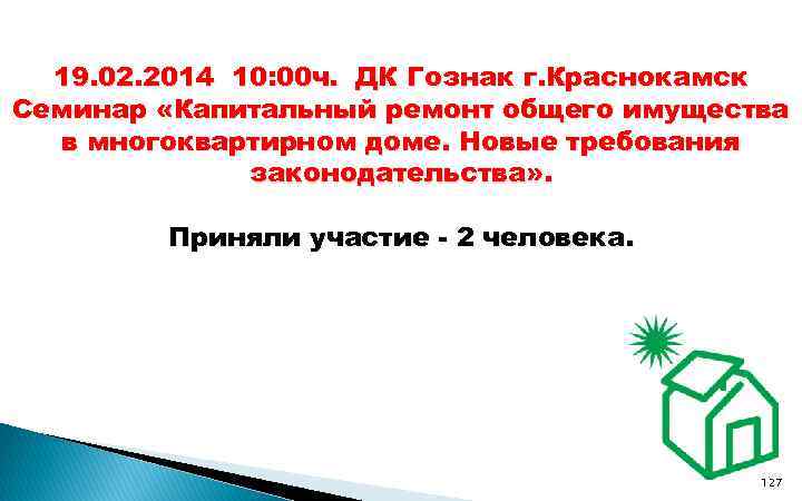 19. 02. 2014 10: 00 ч. ДК Гознак г. Краснокамск Семинар «Капитальный ремонт общего имущества в многоквартирном доме. Новые требования законодательства» . Приняли участие - 2 человека. 127