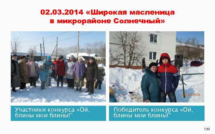 02. 03. 2014 «Широкая масленица в микрорайоне Солнечный» Участники конкурса «Ой, блины мои блины!" Победитель конкурса «Ой, блины мои блины!" 130