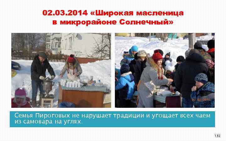 02. 03. 2014 «Широкая масленица в микрорайоне Солнечный» Семья Пироговых не нарушает традиции и угощает всех чаем из самовара на углях. 132