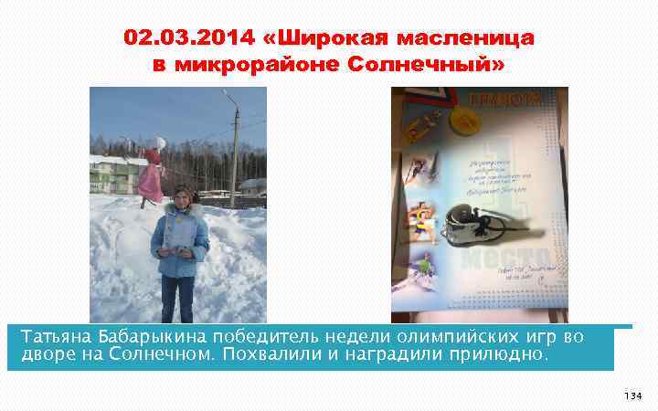 02. 03. 2014 «Широкая масленица в микрорайоне Солнечный» Татьяна Бабарыкина победитель недели олимпийских игр во дворе на Солнечном. Похвалили и наградили прилюдно. 134