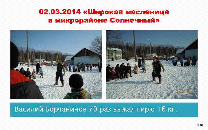 02. 03. 2014 «Широкая масленица в микрорайоне Солнечный» Василий Борчанинов 70 раз выжал гирю 16 кг. 136