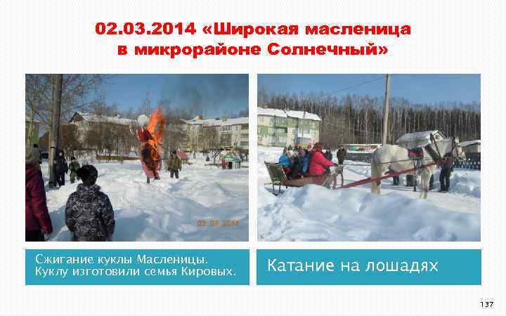 02. 03. 2014 «Широкая масленица в микрорайоне Солнечный» Сжигание куклы Масленицы. Куклу изготовили семья Кировых. Катание на лошадях 137