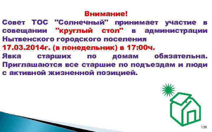Внимание! Совет ТОС "Солнечный" принимает участие в совещании "круглый стол" в администрации Нытвенского городского поселения 17. 03. 2014 г. (в понедельник) в 17: 00 ч. Явка старших по домам обязательна. Приглашаются все старшие по подъездам и люди с активной жизненной позицией. 138