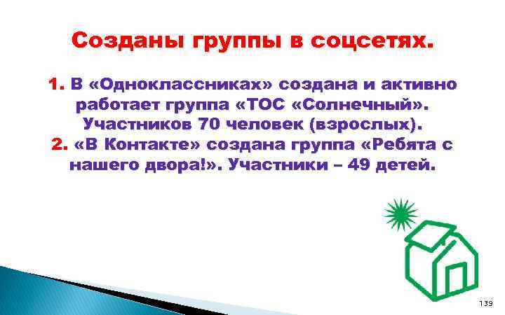 Созданы группы в соцсетях. 1. В «Одноклассниках» создана и активно работает группа «ТОС «Солнечный» . Участников 70 человек (взрослых). 2. «В Контакте» создана группа «Ребята с нашего двора!» . Участники – 49 детей. 139