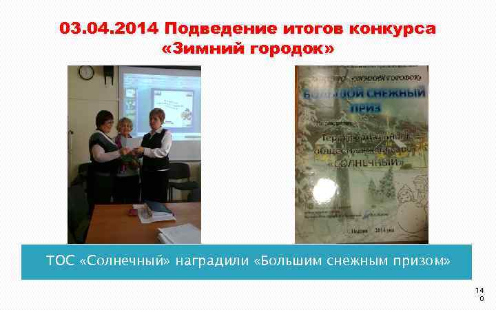 03. 04. 2014 Подведение итогов конкурса «Зимний городок» ТОС «Солнечный» наградили «Большим снежным призом» 14 0