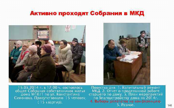 Активно проходят Собрания в МКД Повестка дня: 1. Капитальный ремонт 15. 03. 2014 г. в 17: 00 ч. состоялось МКД. 2. Отчет о проделанной работе общее Собрания собственников жилья старшего по дому. 3. План мероприятий дома № 16/1 по ул. Константина по благоустройству дома на 2014 г. Симонова. Присутствовало: 15 человек; 4. Выборы делегатов на конференцию. ( 15 квартир). 5. Разное. 141