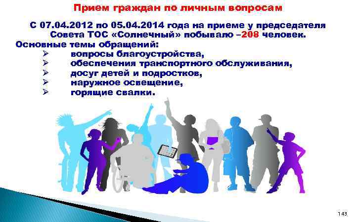 Прием граждан по личным вопросам С 07. 04. 2012 по 05. 04. 2014 года на приеме у председателя Совета ТОС «Солнечный» побывало – 208 человек. Основные темы обращений: Ø вопросы благоустройства, Ø обеспечения транспортного обслуживания, Ø досуг детей и подростков, Ø наружное освещение, Ø горящие свалки. 143