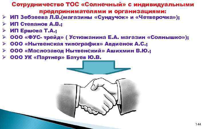 Ø Ø Ø Ø Сотрудничество ТОС «Солнечный» с индивидуальными предпринимателями и организациями: ИП Зебзеева Л. В. (магазины «Сундучок» и «Четверочка» ); ИП Степанов А. В. ; ИП Ершова Т. А. ; ООО «ФУС- трейд» ( Устюжанина Е. А. магазин «Солнышко» ); ООО «Нытвенская типография» Авдиенок А. С. ; ООО «Маслозавод Нытвенский» Ашихмин В. Ю. ; ООО УК «Партнер» Батуев Ю. В. 144