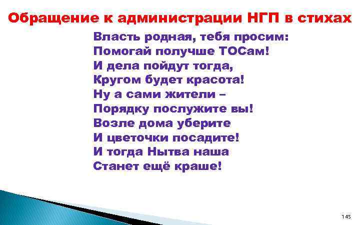 Обращение к администрации НГП в стихах Власть родная, тебя просим: Помогай получше ТОСам! И дела пойдут тогда, Кругом будет красота! Ну а сами жители – Порядку послужите вы! Возле дома уберите И цветочки посадите! И тогда Нытва наша Станет ещё краше! 145