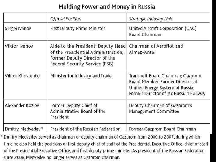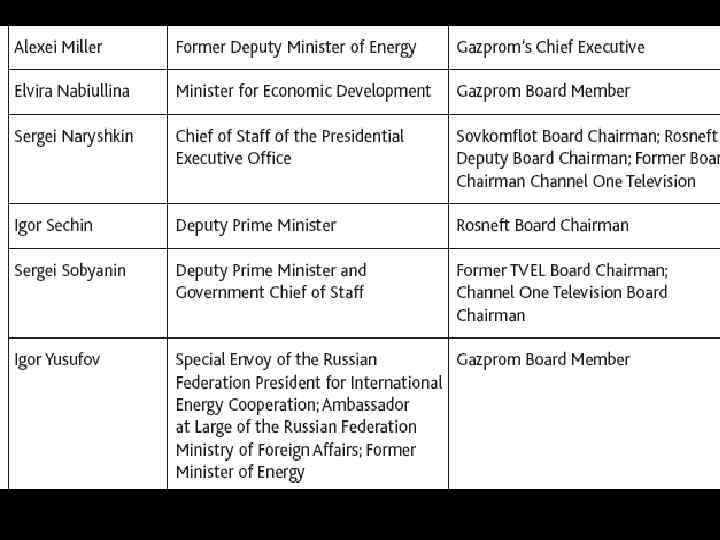 Что мы видим сегодня? • Российское руководство, собрание клановой неформальной группировки, придумало для общественности байку о «суверенной демократии» , а также о смутном драчливом ретроградном национализме. Кремль удержал прямой или косвенный контроль над самыми значимыми средствами массовой информации. На фоне быстрого подъема нефтяных и газовых доходов основная масса населения дала на это молчаливое согласие. Некоторые бесстрашные журналисты посмели заняться расследованием таких проблем, как коррупция и нарушение прав человека. Но они сталкиваются с шантажом, физическим насилием и даже убийствами. Независимые правозащитные группы были отодвинуты на задворки Системы. Не оспариваемая никем внешняя политика продвигает авторитарный стиль правления за пределы страны.