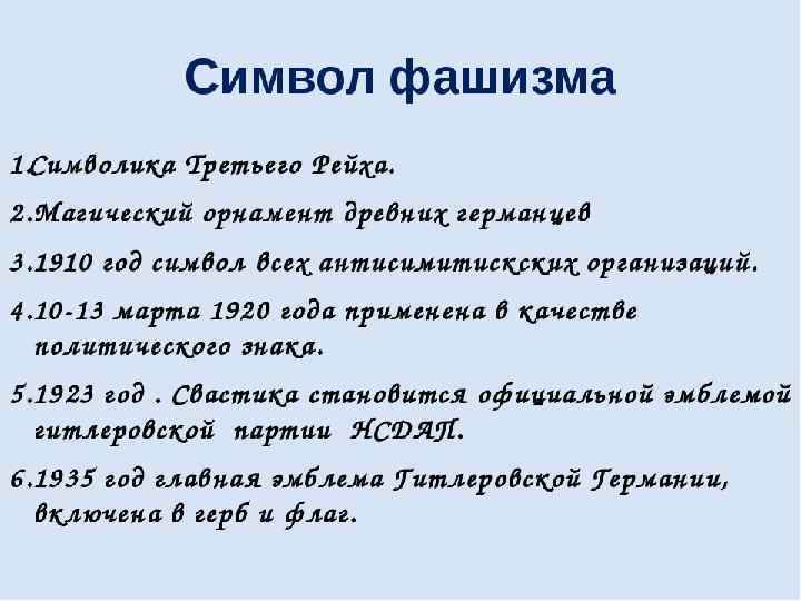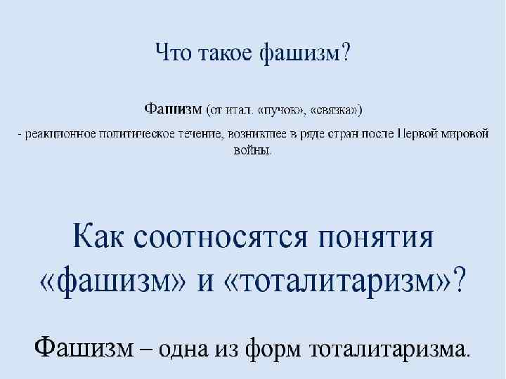 Вывод В 20 -е годы в Италии и в 30 -е годы в Германии к власти приходят фашисты. В этих странах устанавливаются тоталитарные режимы, степень контроля над обществом становится очень высокой. Государства носят антиправовой характер. В них беззаконие и возможность произвола по отношению к гражданам были возведены в ранг закона. Необходимо напомнить о неофашистах на современном этапе. Каждый из нас волен выбирать свой путь, но человеку мыслящему, думающему, образованному не по пути с фашистами.