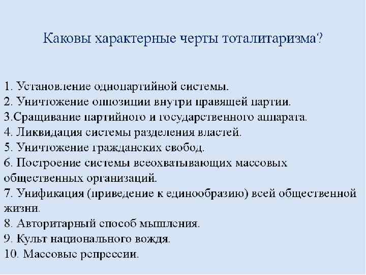 Пятый признак тоталитарной системы это ее стремление к созданию замкнутого, обособленного экономического механизма, который находится под жестким, централизованным контролем государства. Шестым признаком тоталитарной власти является насаждение в обществе одной, единственно верной идеологии.