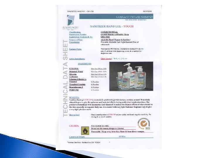 Touch Hand Gel Мыло Удаление легких загрязнений Удаление устойчивых загрязнений (бактерий) Время нанесения Раздражение кожи (чувствительность кожи к продукту) Touch Hand Gel Sanitizer 90% 99, 99% Не действует 99% 30 сек 15 сек + - Table 1. Сравнение с другими гигиеническими средствами