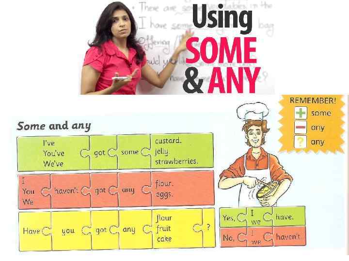 Grammar Местоимения SOME и ANY Используются для обозначения "неопределённого / небольшого" количества предметов или вещества. Они являются определением к существительному и ставятся вместо артикля. На русс. язык обычно не переводятся. SOME + предложения ANY - / ? предложения 1. С исчисл. сущ. во мн. ч. «несколько / некоторое кол-во» 1. С исчисл. сущ. «какие-либо / какиенибудь» I have got some interesting English books to read. - Have you got any interesting books to read? - У У меня есть несколько / некоторое тебя есть какие-нибудь интересные книги? количество интересных книг для чтения. 2. С неисчисл. сущ. «немного / некоторое кол-во» 2. С неисчисл. сущ. «сколько-нибудь» He took some money and went to the cinema. - Он Have you got any chalk here? - У вас есть мел? взял немного денег и пошёл в кино. (хоть немного). 3. При использовании «not» - «никакие» I don't have any stamps at home. – У меня нет (никаких) марок дома.