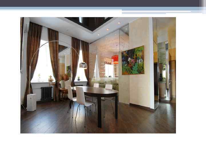 ЗАГАЛЬНА ХАРАКТЕРИСТИКА СТИЛЮ • Для стилю хай - тек характерні: - вживання штучних матеріалів (багато металу, скло, пластик), • - мінімальна кількість деталей, • - чіткі геометричні форми, прямі лінії, • - максимально функціональні меблі (найчастіше з рівною і гладкою поверхнею), • - відсутність декоративних надмірностей.