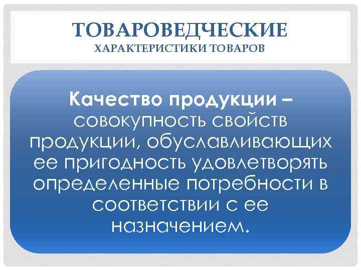 ТОВАРОВЕДЧЕСКИЕ ХАРАКТЕРИСТИКИ ТОВАРОВ Качество продукции – совокупность свойств продукции, обуславливающих ее пригодность удовлетворять определенные потребности в соответствии с ее назначением.