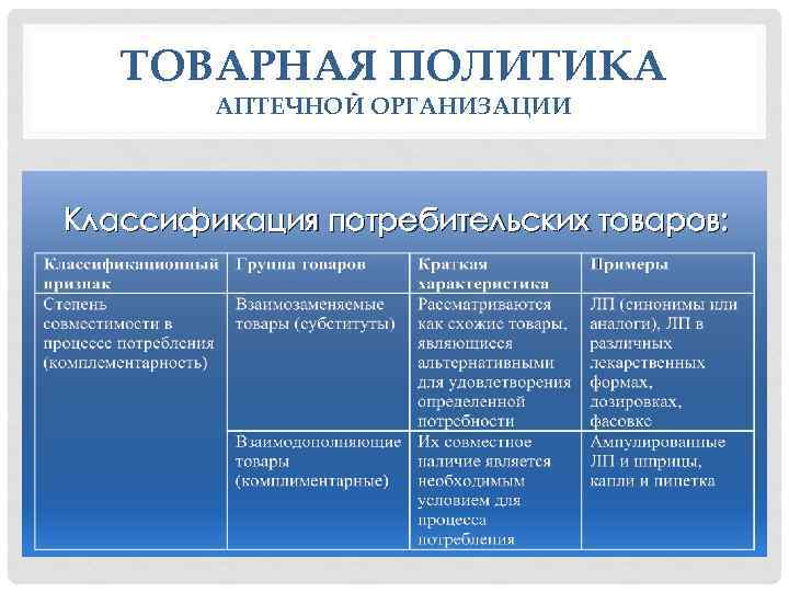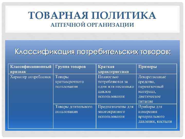 ТОВАРНАЯ ПОЛИТИКА АПТЕЧНОЙ ОРГАНИЗАЦИИ Классификация потребительских товаров: