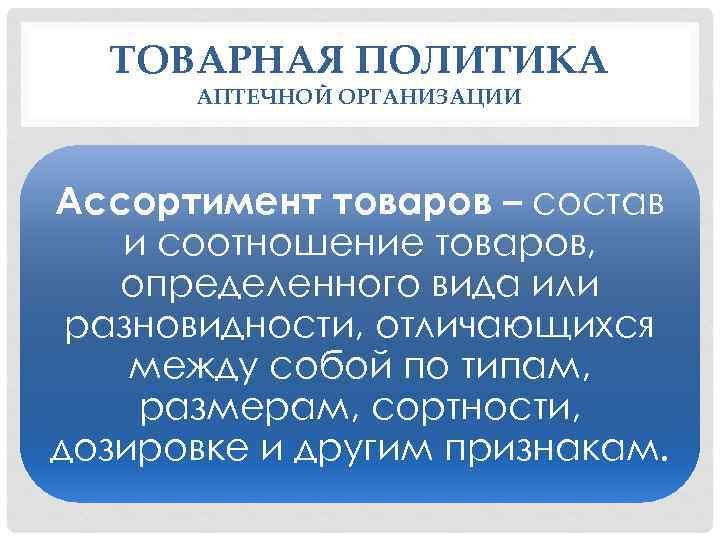 ТОВАРНАЯ ПОЛИТИКА АПТЕЧНОЙ ОРГАНИЗАЦИИ Ассортимент товаров – состав и соотношение товаров, определенного вида или разновидности, отличающихся между собой по типам, размерам, сортности, дозировке и другим признакам.
