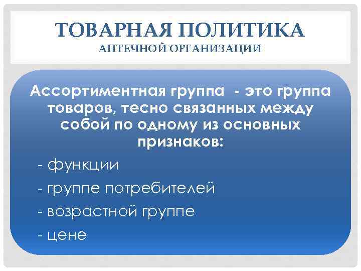 ТОВАРНАЯ ПОЛИТИКА АПТЕЧНОЙ ОРГАНИЗАЦИИ Ассортиментная группа - это группа товаров, тесно связанных между собой по одному из основных признаков: - функции - группе потребителей - возрастной группе - цене