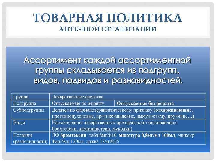 ТОВАРНАЯ ПОЛИТИКА АПТЕЧНОЙ ОРГАНИЗАЦИИ Ассортимент каждой ассортиментной группы складывается из подгрупп, видов, подвидов и разновидностей.