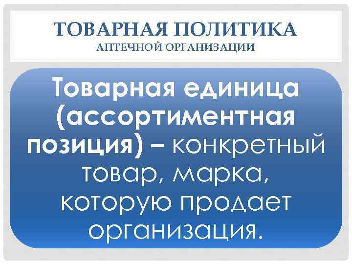 ТОВАРНАЯ ПОЛИТИКА АПТЕЧНОЙ ОРГАНИЗАЦИИ Товарная единица (ассортиментная позиция) – конкретный товар, марка, которую продает организация.