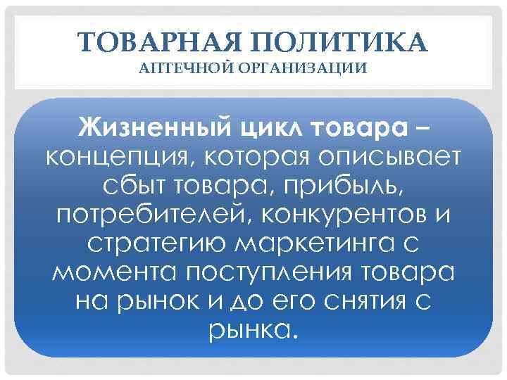 ТОВАРНАЯ ПОЛИТИКА АПТЕЧНОЙ ОРГАНИЗАЦИИ Жизненный цикл товара – концепция, которая описывает сбыт товара, прибыль, потребителей, конкурентов и стратегию маркетинга с момента поступления товара на рынок и до его снятия с рынка.