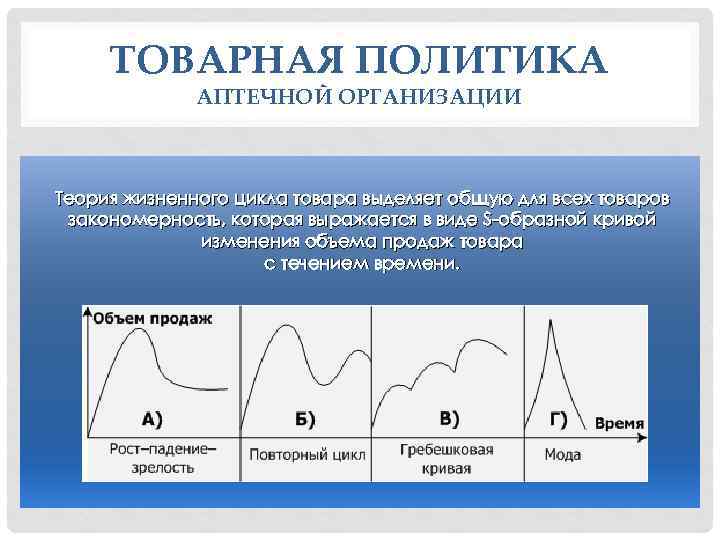 ТОВАРНАЯ ПОЛИТИКА АПТЕЧНОЙ ОРГАНИЗАЦИИ Теория жизненного цикла товара выделяет общую для всех товаров закономерность, которая выражается в виде S-образной кривой изменения объема продаж товара с течением времени.