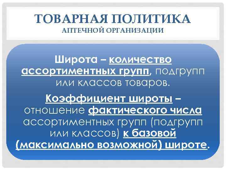 ТОВАРНАЯ ПОЛИТИКА АПТЕЧНОЙ ОРГАНИЗАЦИИ Широта – количество ассортиментных групп, подгрупп или классов товаров. Коэффициент широты – отношение фактического числа ассортиментных групп (подгрупп или классов) к базовой (максимально возможной) широте.