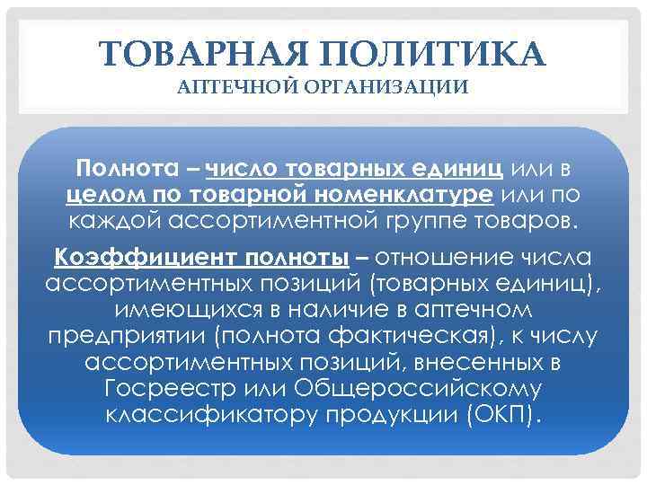ТОВАРНАЯ ПОЛИТИКА АПТЕЧНОЙ ОРГАНИЗАЦИИ Полнота – число товарных единиц или в целом по товарной номенклатуре или по каждой ассортиментной группе товаров. Коэффициент полноты – отношение числа ассортиментных позиций (товарных единиц), имеющихся в наличие в аптечном предприятии (полнота фактическая), к числу ассортиментных позиций, внесенных в Госреестр или Общероссийскому классификатору продукции (ОКП).