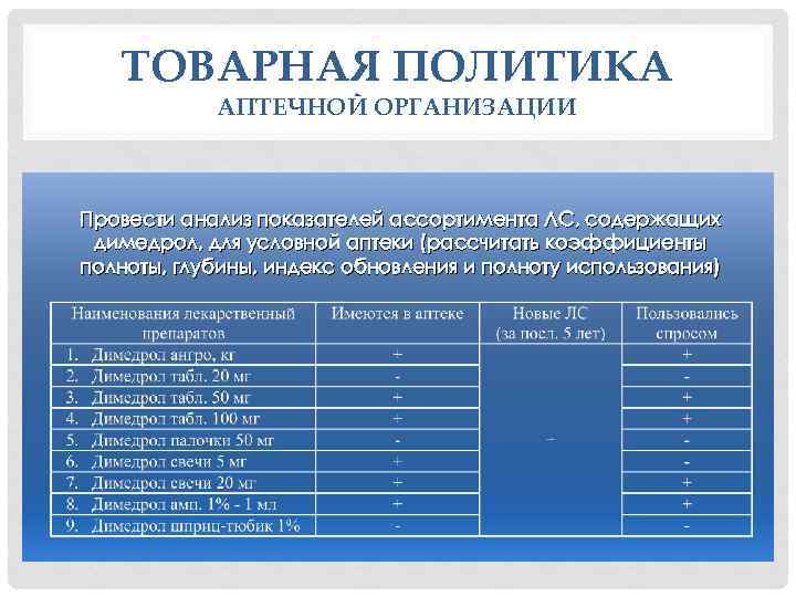 ТОВАРНАЯ ПОЛИТИКА АПТЕЧНОЙ ОРГАНИЗАЦИИ Провести анализ показателей ассортимента ЛС, содержащих димедрол, для условной аптеки (рассчитать коэффициенты полноты, глубины, индекс обновления и полноту использования)