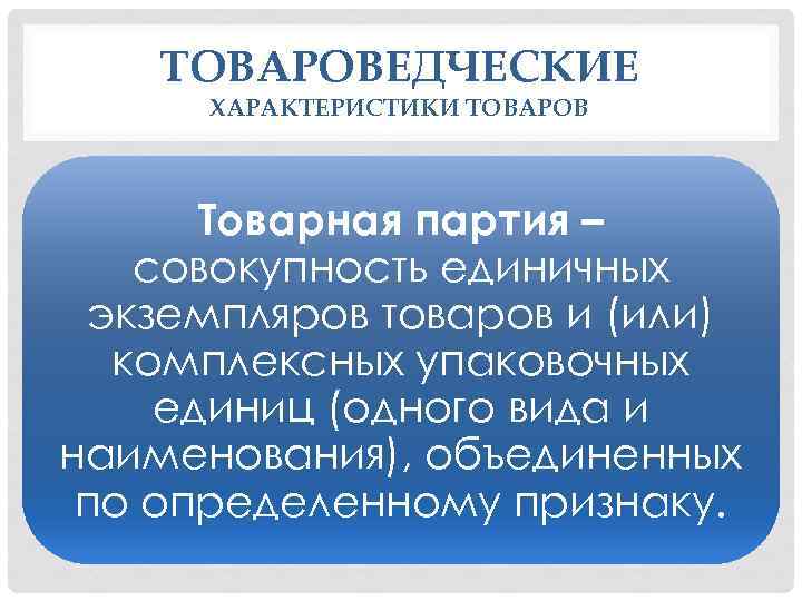 ТОВАРОВЕДЧЕСКИЕ ХАРАКТЕРИСТИКИ ТОВАРОВ Товарная партия – совокупность единичных экземпляров товаров и (или) комплексных упаковочных единиц (одного вида и наименования), объединенных по определенному признаку.