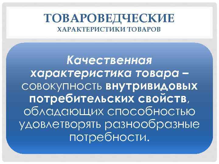ТОВАРОВЕДЧЕСКИЕ ХАРАКТЕРИСТИКИ ТОВАРОВ Качественная характеристика товара – совокупность внутривидовых потребительских свойств, обладающих способностью удовлетворять разнообразные потребности.