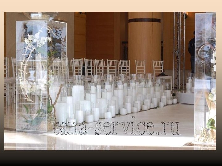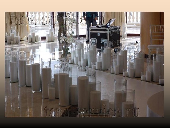 Наши возможности: • • • Насыпные свечи (продажа, аренда); Оформление свадеб и мероприятий насыпными свечами. Столовый текстиль в наличии и на заказ (салфетки, скатерти, кармашки, вафельное полотно); Продажа тканей; Махровые полотенца, салфетки, халаты и коврики. Стеклянная продукция ( подсвечники, вазы, колбы, бокалы, декантеры) Металлическая продукция для декора (подсвечники, вазы, подставки для вина и т. д) Декоративные элементы для флористики и оформления. Профессиональная вышивка на тканях.
