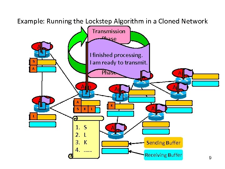 Example: Running the Lockstep Algorithm in a Cloned Network Transmission Phase App S I finished processing. transmitting. I am ready to transmit. Processing process. S A Phase App L K A S K App App App L K App L 1. 2. 3. 4. S L K …… App Sending Buffer Receiving Buffer 9