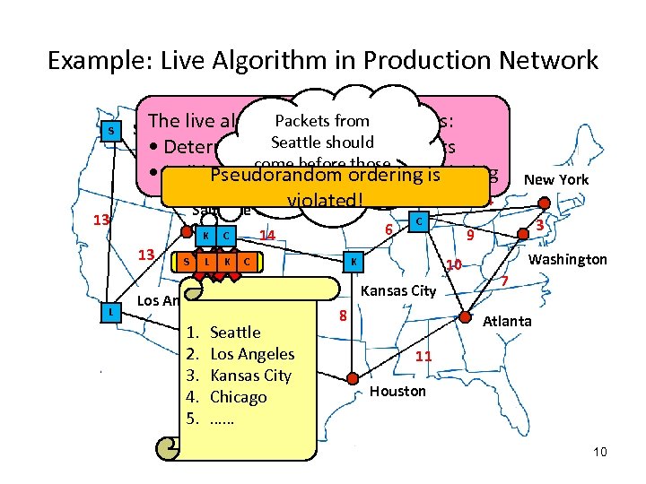 Example: Live Algorithm in Production Network S 13 The Seattle Packets from live algorithm does two things: Seattle should • Determine the ordering of events come before those • 10 back events violating the ordering Roll Pseudorandom ordering is from Los Angeles Chicago 14 violated! Salt Lake City K 13 L S C K 14 C K L C Los Angeles 1. 2. 3. 4. 5. 6 Seattle 16 Angeles Los Kansas City Chicago …… C Kansas City 8 3 9 10 K New York Washington 7 Atlanta 11 Houston 10