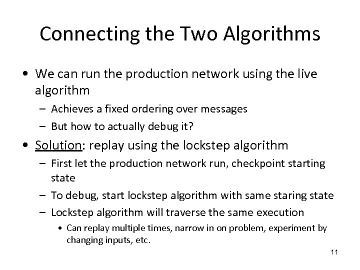 Connecting the Two Algorithms • We can run the production network using the live algorithm – Achieves a fixed ordering over messages – But how to actually debug it? • Solution: replay using the lockstep algorithm – First let the production network run, checkpoint starting state – To debug, start lockstep algorithm with same staring state – Lockstep algorithm will traverse the same execution • Can replay multiple times, narrow in on problem, experiment by changing inputs, etc. 11