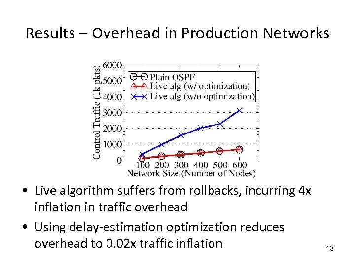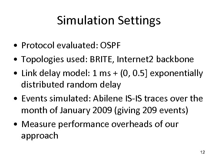 Simulation Settings • Protocol evaluated: OSPF • Topologies used: BRITE, Internet 2 backbone • Link delay model: 1 ms + (0, 0. 5] exponentially distributed random delay • Events simulated: Abilene IS-IS traces over the month of January 2009 (giving 209 events) • Measure performance overheads of our approach 12